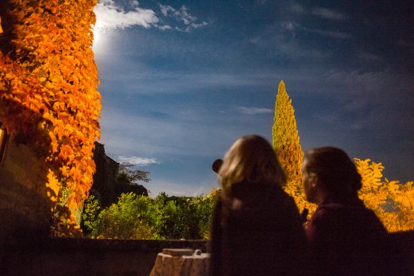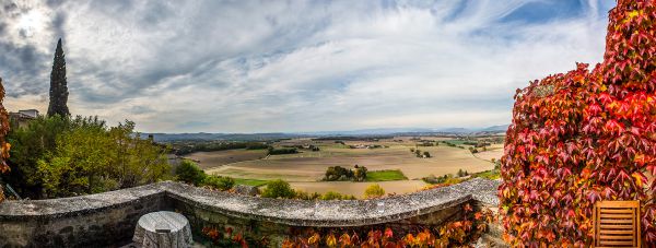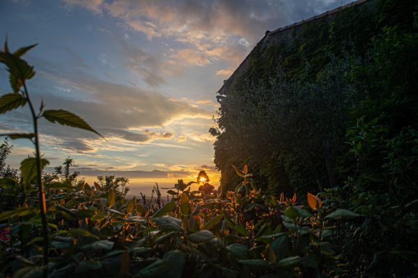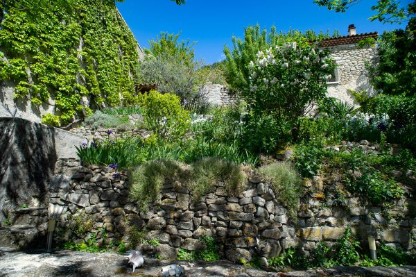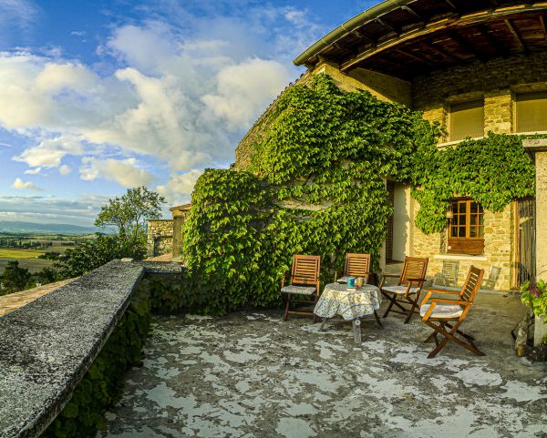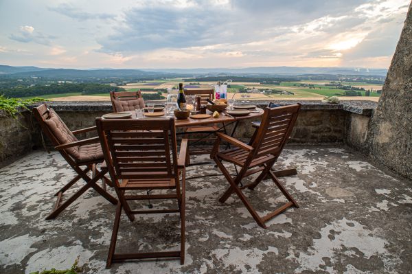 Für die - im Übrigen größtenteils uneinsehbare - Terrasse gibt es sowohl Liegestühle, als auch normale Gartenmöbel und ein kleines Tischchen. Am besten sitzt oder liegt man ohnehin auf der breiten Brüstung. Mit ihrer Südwestausrichtung ist sie den ganzen Tag besonnt, bis abends am Horizont die Sonne untergeht. Eine Mauer auf der Nordseite schützt vor dem häufigen, aber schönes Wetter garantierenden Nordwind, dem Mistral. Auf der breiten Mauer kann gesessen, gelegen und natürlich der Apéritif eingenommen werden.