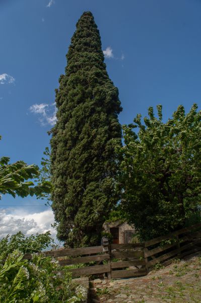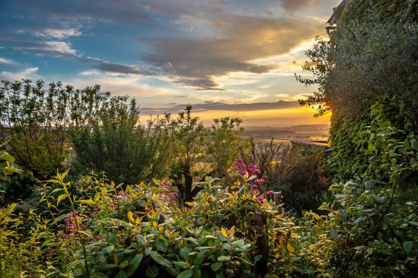 Auf der zweiten Ebene befindet sich auch der Garten mit der unteren Terrasse und dem durch Trockenmauern terrassierten mediterranen Garten. Man hat bereits von dieser Terrasse einen wunderbaren Blick in die Ebene. Hier wird gefrühstückt, abends mit Blick auf den Sonnenuntergang gegessen und auch im fest gemauerten Grill gegrillt. Zwei große Akazien spenden im Sommer den nötigen Schatten und die Basis für die Hängematte.