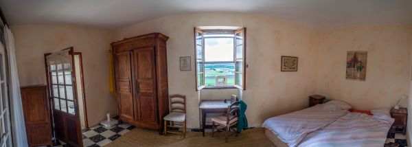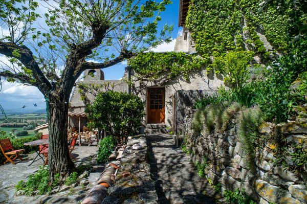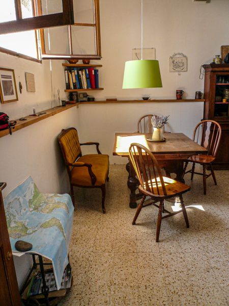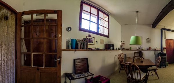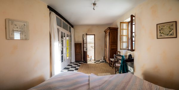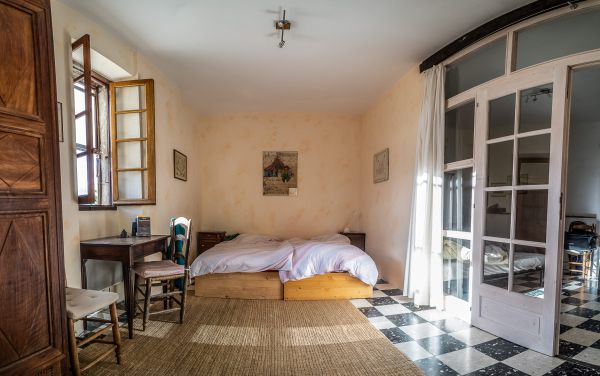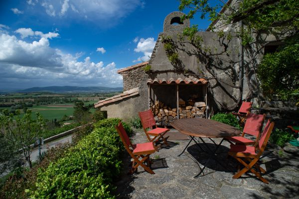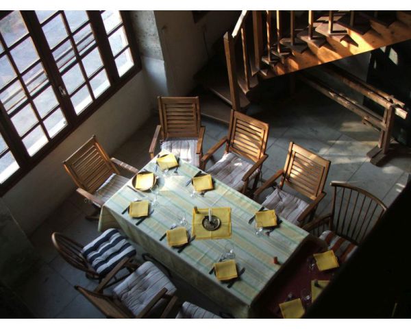 Die Bergerie, der ehemalige Schafstall, ist ein 5 Meter hoher Raum mit einer Galerie. Geprägt ist er durch den großen offenen Kamin, in dem auch schon ganze Lammkeulen zubereitet wurden... Hier kann an kühleren Abenden gemütlich am Feuer gesessen werden, im Hochsommer hingegen bleibt der Raum angenehm kühl. Durch das große Panoramafenster belichtet, kann man sich hier in Ruhe zurückziehen und lesen oder Musik hören - oder für große Runden eine Tafel aufbauen.