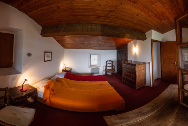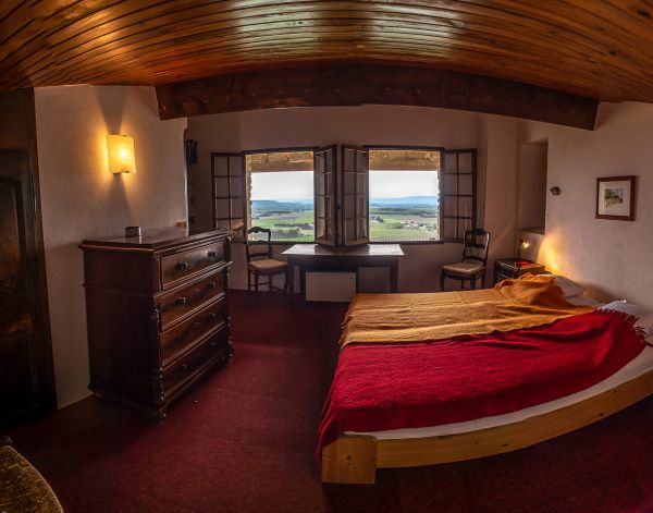 Das Blaue Zimmer (inzwischen ist es nicht mehr blau, der Name ist aber geblieben) hat Blick zur Ebene und Zugang zur Terrasse für insgesamt vier Personen plus Kinderbett. Das blaue Zimmer kann mit dem Kaminzimmer für Familien über eine Flügeltür miteinander verbunden werden.